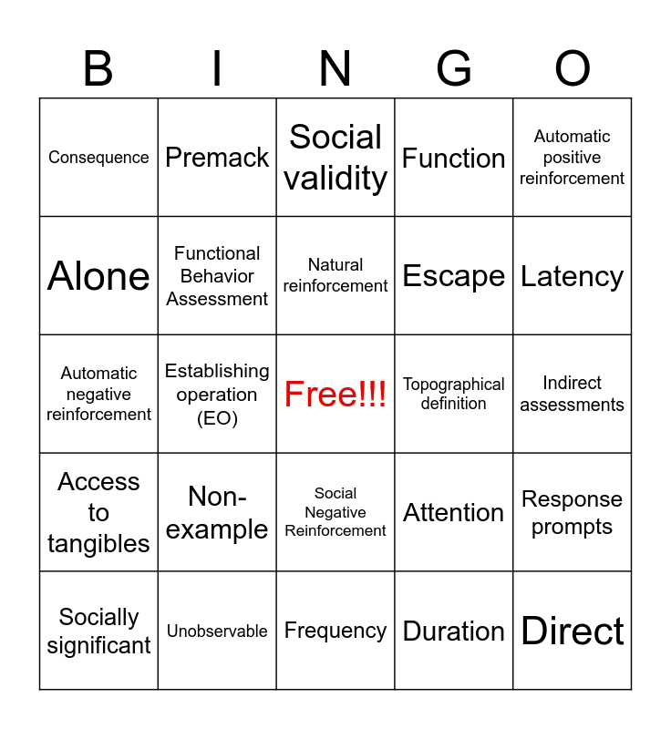 This bingo card has a free space and 29 words: Socially significant, Test Content Outline, Establishing operation (EO), Antecedent, Consequence, Social validity, Functional Behavior Assessment, Non-example, Topographical definition, Unobservable, Indirect assessments, Direct, Frequency, Duration, Latency, Social Positive Reinforcement, Social Negative Reinforcement, Access to tangibles, Automatic positive reinforcement, Automatic negative reinforcement, Attention, Play, Escape, Alone, Function, Premack, Response prompts, Natural reinforcement and Paired Stimulus.