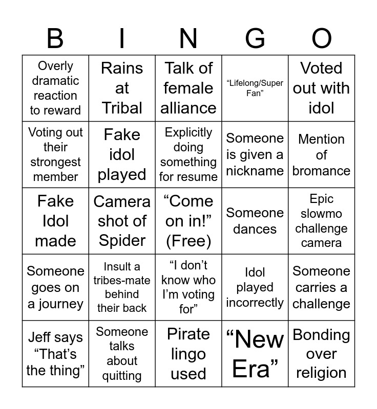 This bingo card has a free space and 77 words: “That’s how you do it”, Someone finds an idol/advantage, Talk of female alliance, Reference a past player, Injury or Medic call, Bag searching, Confession Cry, “This game is hard/changing”, Swearing on family, “It’s just a game”, Camera shot of Shark, “They’re a threat.”, Explicitly doing something for resume, Voting out their strongest member, “Final Three, Ya’ll”, Camera shot of Spider, Camera shot of Snake, Bonding over religion, Someone does something excessively queer, Voted out with idol, Nudity, Fake Idol made, Fake idol played, Rains at Tribal, “Lifelong/Super Fan”, Challenge throwing, “I’m good at puzzles” to team, “I’m running things”, “I’m on the bottom”, “I’m under the radar”, Telling someone they have an idol, Someone bombs at a challenge, Idol played, Idol played incorrectly, Mention of bromance, Someone is given a nickname, Romance, “This is for revenge”, Epic slowmo challenge camera, “New Era”, Piano music over emotional moment, Flashback to past season, “I’m the swing vote”, “Target on their back”, “We have the numbers”, “Survivor gods”, Jeff says “That’s the thing”, Overly dramatic reaction to reward, Dramatic reaction to previous vote out, Someone catches a fish, Complete emotional breakdown, “I don’t know who I’m voting for”, Live Tribal, “You’re my #1” or “Ride or Die”, “Who flipped ?”, Sabotaging own camp, Called out for “not pulling weight”, Someone bleeds on-screen, “Blindside”, Native Tribesman shown, Insult a tribes-mate behind their back, Someone plays the race card, Jeff instigates too much at Tribal, “Dig deep” or “Reach down”, Jeff prods for an emotional reaction, “Old school survivor”, Someone sings, Someone dances, Someone quotes or mentions outside media, Called out at Tribal, Strategizing at the well, Someone carries a challenge, Someone goes on a journey, Someone talks about quitting, “They’re a goat” or similar, Pirate lingo used and Someone takes or destroys someone’s “item”.