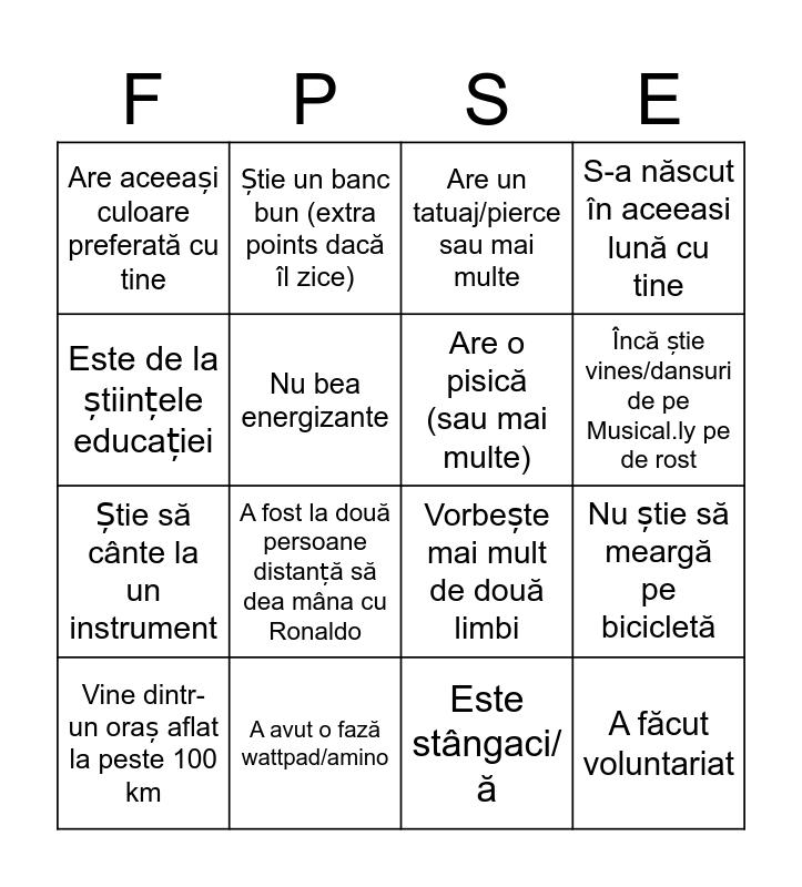 This bingo card has 16 words: A avut o fază wattpad/amino, Nu știe să meargă pe bicicletă, Are un tatuaj/pierce sau mai multe, Are aceeași culoare preferată cu tine, Știe să cânte la un instrument, Știe un banc bun (extra points dacă îl zice), Vorbește mai mult de două limbi, Este stângaci/ă, Este de la științele educației, Nu bea energizante, Vine dintr-un oraș aflat la peste 100 km, S-a născut în aceeasi lună cu tine, A fost la două persoane distanță să dea mâna cu Ronaldo, Încă știe vines/dansuri de pe Musical.ly pe de rost, Are o pisică (sau mai multe) and A făcut voluntariat.