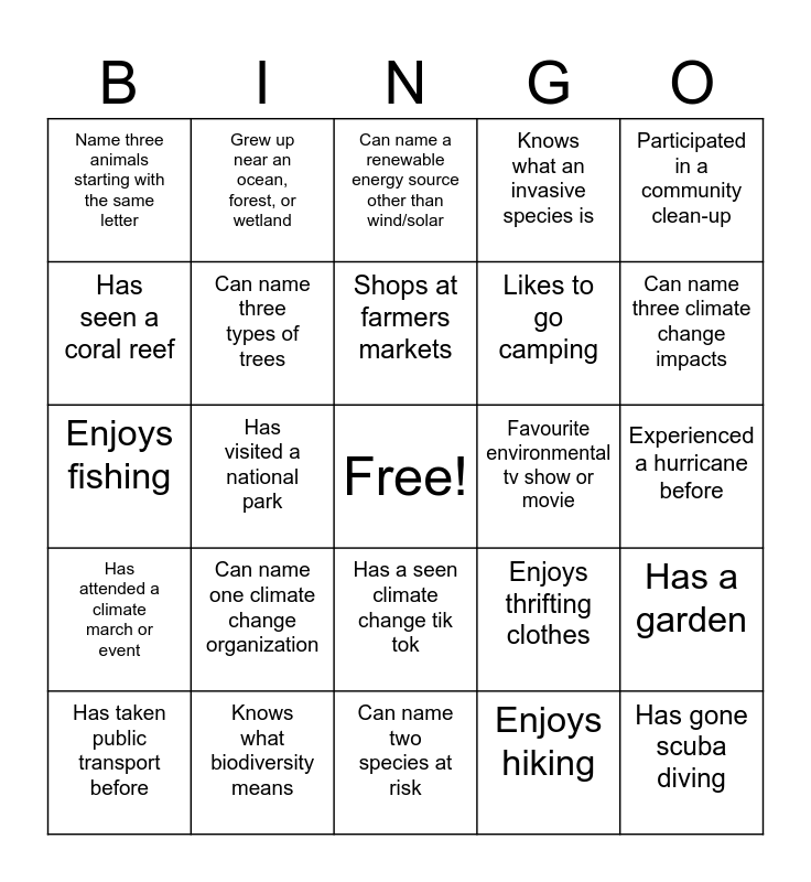 This bingo card has a free space and 24 words: Has taken public transport before, Can name one climate change organization, Shops at farmers markets, Enjoys hiking, Participated in a community clean-up, Name three animals starting with the same letter, Grew up near an ocean, forest, or wetland, Can name a renewable energy source other than wind/solar, Favourite environmental tv show or movie, Experienced a hurricane before, Enjoys fishing, Can name three types of trees, Enjoys thrifting clothes, Has a garden, Has seen a coral reef, Knows what biodiversity means, Can name two species at risk, Knows what an invasive species is, Can name three climate change impacts, Has attended a climate march or event, Has visited a national park, Has a seen climate change tik tok, Likes to go camping and Has gone scuba diving.