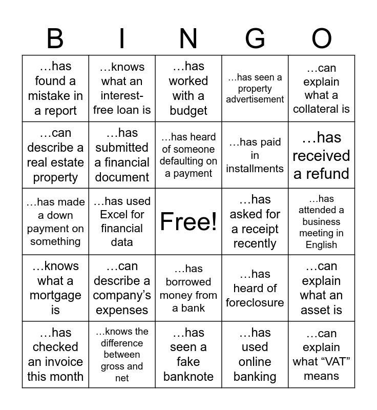This bingo card has a free space and 29 words: …has checked an invoice this month, …knows what a balance sheet is, …has used Excel for financial data, …can explain what an auditor does, …has found a mistake in a report, …has worked with a budget, …has submitted a financial document, …can describe a company’s expenses, …has asked for a receipt recently, …knows the difference between gross and net, …has attended a business meeting in English, …can explain what “VAT” means, …has seen a fake banknote, …has used online banking, …has received a refund, …can name a currency other than the euro, …has borrowed money from a bank, …knows what a mortgage is, …can explain what a collateral is, …has made a down payment on something, …has heard of foreclosure, …knows the difference between a borrower and a lender, …has paid in installments, …can describe a real estate property, …has seen a property advertisement, …knows what an interest-free loan is, …can explain what an asset is, …has heard of someone defaulting on a payment and ...knows what an asset is.