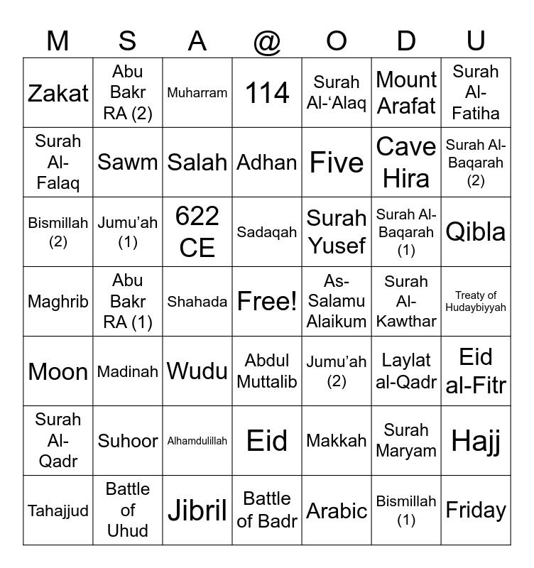 This bingo card has a free space and 48 words: Makkah, Cave Hira, Battle of Badr, Abu Bakr RA (1), 622 CE, Treaty of Hudaybiyyah, Abu Bakr RA (2), Battle of Uhud, Mount Arafat, Abdul Muttalib, Surah Al-Fatiha, 114, Surah Al-Baqarah (1), Surah Yusef, Surah Al-Qadr, Surah Al-Kawthar, Surah Al-Falaq, Surah Al-Baqarah (2), Surah Maryam, Surah Al-‘Alaq, Five, Shahada, Zakat, Sawm, Hajj, Salah, Qibla, Tahajjud, Sadaqah, Jumu’ah (1), Bismillah (1), As-Salamu Alaikum, Eid al-Fitr, Suhoor, Maghrib, Jumu’ah (2), Laylat al-Qadr, Bismillah (2), Wudu, Alhamdulillah, Moon, Friday, Muharram, Jibril, Adhan, Eid, Madinah and Arabic.