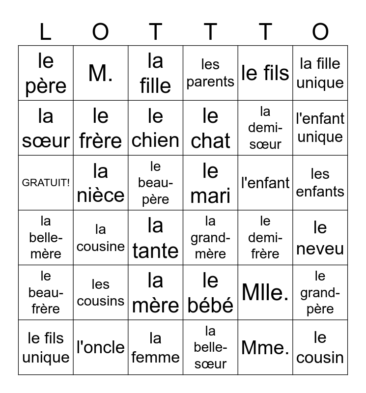 This bingo card has 36 words: le bébé, la mère, la belle-sœur, la sœur, la belle-mère, le mari, le frère, la femme, le fils, Mlle., l'enfant unique, les parents, le grand-père, la nièce, le chat, le père, le beau-frère, l'enfant, GRATUIT!, la fille, le beau-père, la cousine, la grand-mère, la tante, le demi-frère, M., la demi-sœur, l'oncle, le chien, la fille unique, le cousin, le fils unique, le neveu, les enfants, les cousins and Mme..