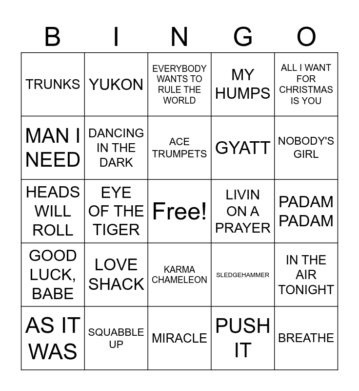 This bingo card has a free space and 31 words: MIRACLE, RELAX, EYE OF THE TIGER, JUMP, TRUNKS, EVERYBODY WANTS TO RULE THE WORLD, DANCING IN THE DARK, SLEDGEHAMMER, LIVIN ON A PRAYER, PUSH IT, PADAM PADAM, BREATHE, JUST A FRIEND, I'M SPRUNG, NOBODY'S GIRL, ILLUSION, IN THE AIR TONIGHT, LOVE SHACK, GOOD LUCK, BABE, KARMA CHAMELEON, ALL I WANT FOR CHRISTMAS IS YOU, FLOWERS, AS IT WAS, YUKON, GYATT, MAN I NEED, MY HUMPS, HEADS WILL ROLL, SQUABBLE UP, ACE TRUMPETS and APT..
