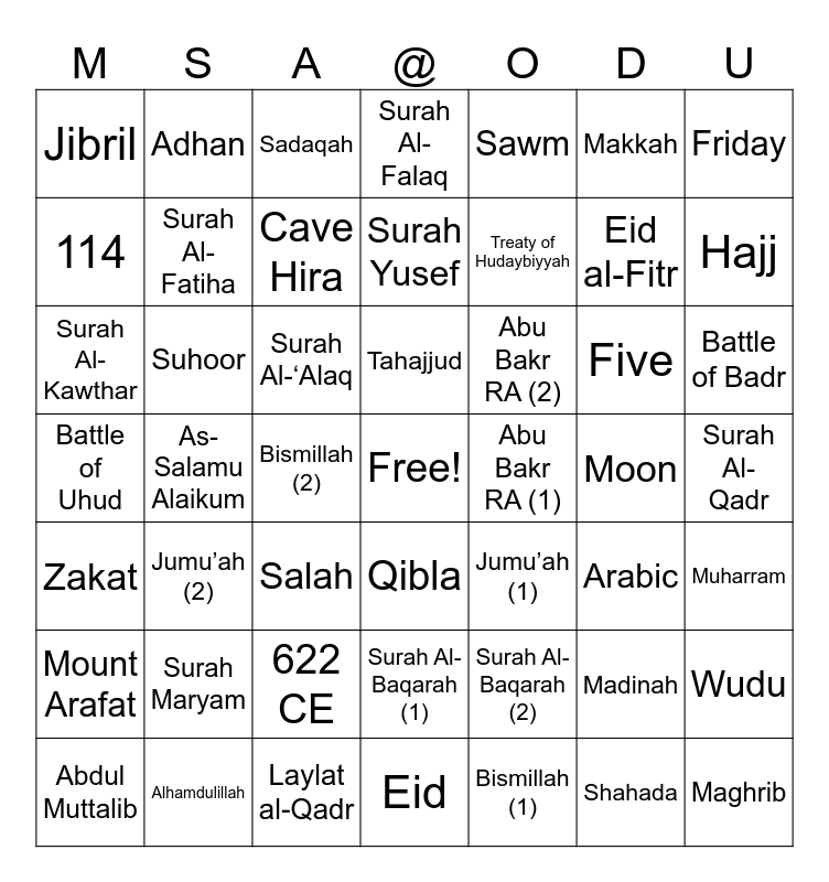 This bingo card has a free space and 48 words: Surah Al-Baqarah (2), Eid al-Fitr, Eid, As-Salamu Alaikum, Surah Al-‘Alaq, Surah Al-Qadr, Adhan, Alhamdulillah, Makkah, Qibla, Friday, Surah Al-Falaq, Five, Abu Bakr RA (2), Mount Arafat, Moon, 114, Hajj, Madinah, Sawm, Treaty of Hudaybiyyah, Bismillah (2), Jibril, Surah Al-Fatiha, Wudu, Cave Hira, Battle of Badr, Abdul Muttalib, Tahajjud, Suhoor, Shahada, Abu Bakr RA (1), Muharram, Surah Maryam, Battle of Uhud, Jumu’ah (1), Arabic, Surah Al-Kawthar, Salah, 622 CE, Zakat, Maghrib, Sadaqah, Laylat al-Qadr, Surah Yusef, Surah Al-Baqarah (1), Jumu’ah (2) and Bismillah (1).