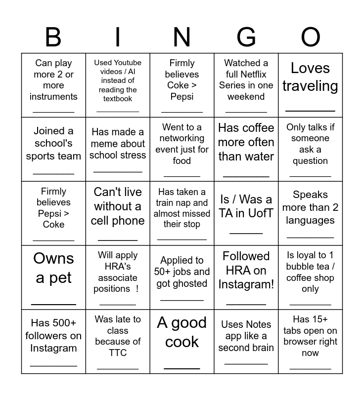 This bingo card has 25 words: Will apply HRA's associate positions ! _______, A good cook ____, Went to a networking event just for food _______, Has 500+ followers on Instagram ________, Loves traveling ______, Can play more 2 or more instruments ________, Joined a school's sports team _______, Used Youtube videos / AI instead of reading the textbook __________, Is / Was a TA in UofT _____, Applied to 50+ jobs and got ghosted ________, Has coffee more often than water _______, Firmly believes Pepsi > Coke ________, Followed HRA on Instagram! ______, Is loyal to 1 bubble tea / coffee shop only ________, Has made a meme about school stress _________, Has 15+ tabs open on browser right now ________, Speaks more than 2 languages ________, Firmly believes Coke > Pepsi ________, Only talks if someone ask a question ________, Can't live without a cell phone ______, Has taken a train nap and almost missed their stop __________, Was late to class because of TTC ________, Owns a pet _____, Watched a full Netflix Series in one weekend ________ and Uses Notes app like a second brain ________.