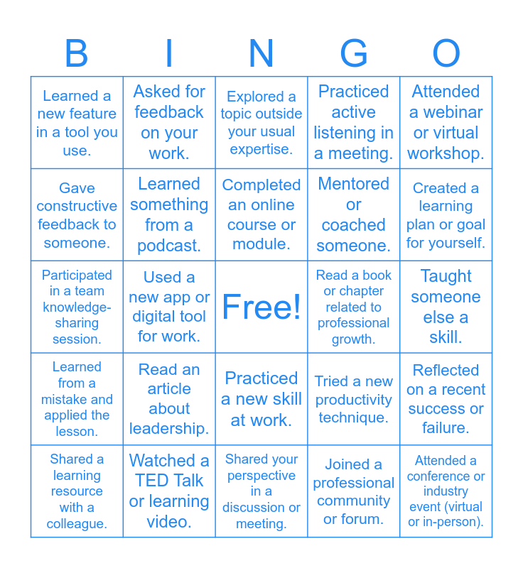 This bingo card has a free space and 24 words: Read an article about leadership., Watched a TED Talk or learning video., Completed an online course or module., Shared a learning resource with a colleague., Attended a webinar or virtual workshop., Learned a new feature in a tool you use., Gave constructive feedback to someone., Asked for feedback on your work., Read a book or chapter related to professional growth., Practiced a new skill at work., Mentored or coached someone., Participated in a team knowledge-sharing session., Tried a new productivity technique., Reflected on a recent success or failure., Learned something from a podcast., Joined a professional community or forum., Taught someone else a skill., Explored a topic outside your usual expertise., Created a learning plan or goal for yourself., Used a new app or digital tool for work., Attended a conference or industry event (virtual or in-person)., Learned from a mistake and applied the lesson., Practiced active listening in a meeting. and Shared your perspective in a discussion or meeting..