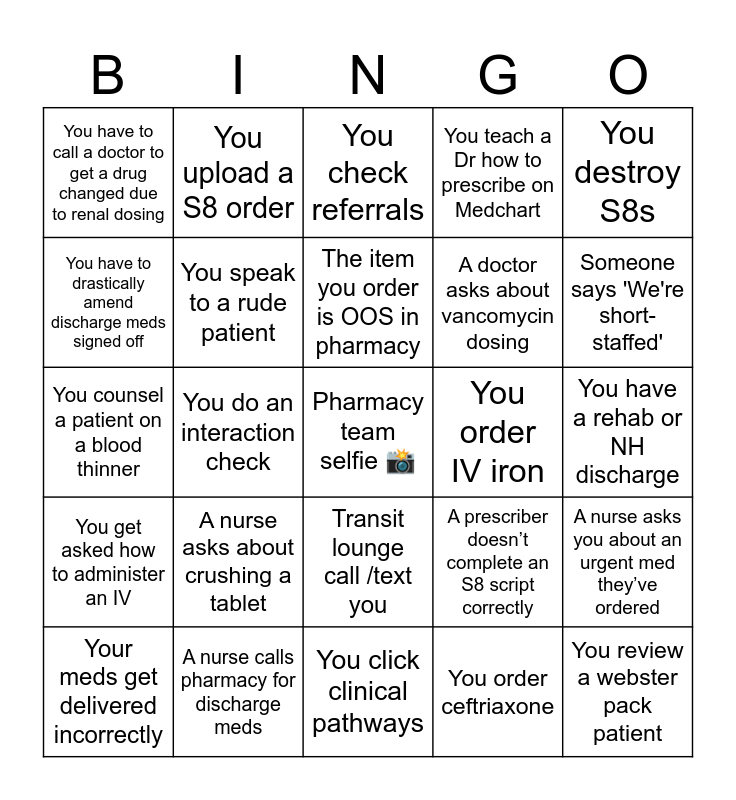 This bingo card has a free space and 24 words: A nurse asks about crushing a tablet, A nurse calls pharmacy for discharge meds, The item you order is OOS in pharmacy, Your meds get delivered incorrectly, You destroy S8s, You have to call a doctor to get a drug changed due to renal dosing, You have to drastically amend discharge meds signed off, You upload a S8 order, You order IV iron, Transit lounge call /text you, A doctor asks about vancomycin dosing, You counsel a patient on a blood thinner, A prescriber doesn’t complete an S8 script correctly, A nurse asks you about an urgent med they’ve ordered, You speak to a rude patient, You order ceftriaxone, You have a rehab or NH discharge, You check referrals, Someone says 'We're short-staffed', You do an interaction check, You review a webster pack patient, You get asked how to administer an IV, You teach a Dr how to prescribe on Medchart and You click clinical pathways.