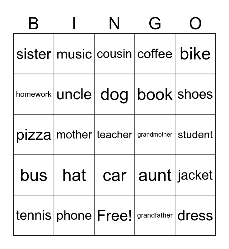 This bingo card has 31 words: Free!, father, mother, brother, sister, cousin, uncle, aunt, grandmother, grandfather, student, teacher, dress, jeans, shoes, shirt, jacket, hat, bus, car, bike, soccer, tennis, music, book, homework, coffee, pizza, phone, dog and cat.
