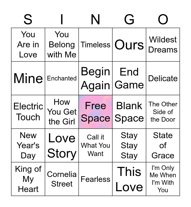 This bingo card has a free space and 49 words: Our Song, I'm Only Me When I'm With You, Jump then Fall, Fearless, Love Story, Hey Stephen, You Belong with Me, The Way I Loved You, Mine, Sparks Fly, Enchanted, Ours, State of Grace, Stay Stay Stay, Holy Ground, Everything Has Changed, Begin Again, Blank Space, Style, Wildest Dreams, How You Get the Girl, This Love, You Are in Love, End Game, Don't Blame Me, Delicate, King of My Heart, Dress, Call it What You Want, New Year's Day, Cruel Summer, Lover, I Think He Knows, Paper Rings, Cornelia Street, False God, Daylight, Invisible String, The Other Side of the Door, Today Was a Fairytale, Message in a Bottle, Snow on the Beach, Paris, Karma, Electric Touch, Timeless, But Daddy I Love Him, So High School and The Alchemy.