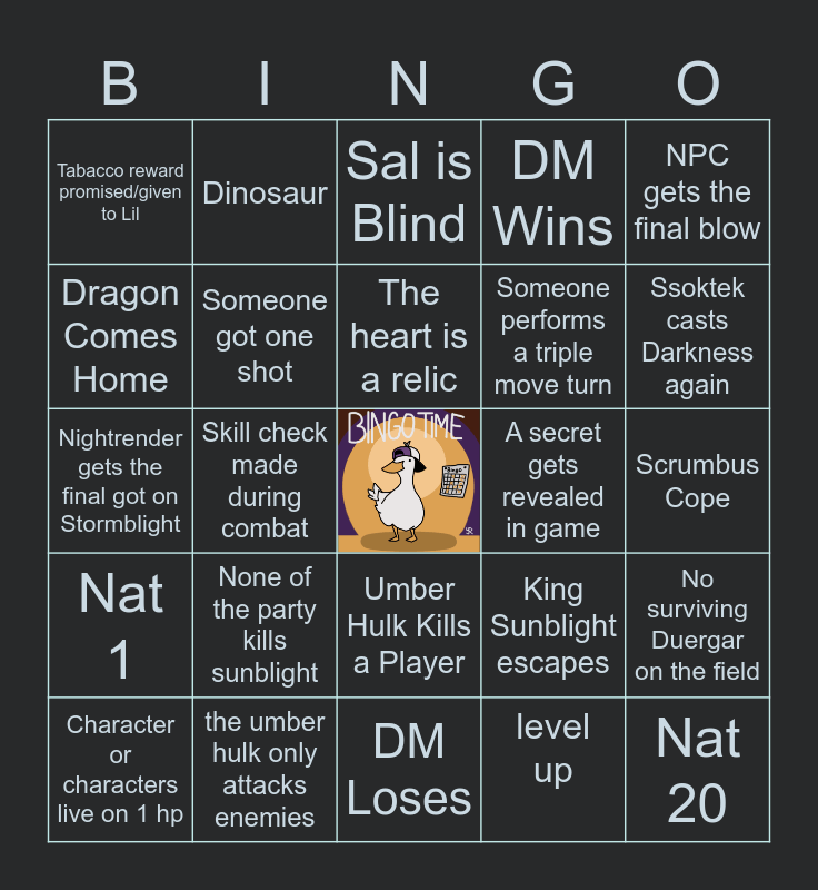 This bingo card has a free space and 24 words: None of the party kills sunblight, the umber hulk only attacks enemies, The heart is a relic, Character or characters live on 1 hp, NPC gets the final blow, Tabacco reward promised/given to Lil, Dragon Comes Home, Dinosaur, A secret gets revealed in game, Umber Hulk Kills a Player, Someone performs a triple move turn, Nightrender gets the final got on Stormblight, King Sunblight escapes, No surviving Duergar on the field, Someone got one shot, level up, Scrumbus Cope, Sal is Blind, Ssoktek casts Darkness again, Skill check made during combat, Nat 20, Nat 1, DM Wins and DM Loses.
