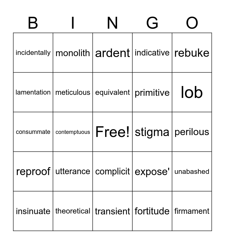 This bingo card has a free space and 24 words: utterance, theoretical, equivalent, insinuate, rebuke, incidentally, lamentation, monolith, stigma, complicit, primitive, consummate, expose', unabashed, meticulous, fortitude, perilous, ardent, lob, contemptuous, firmament, reproof, indicative and transient.