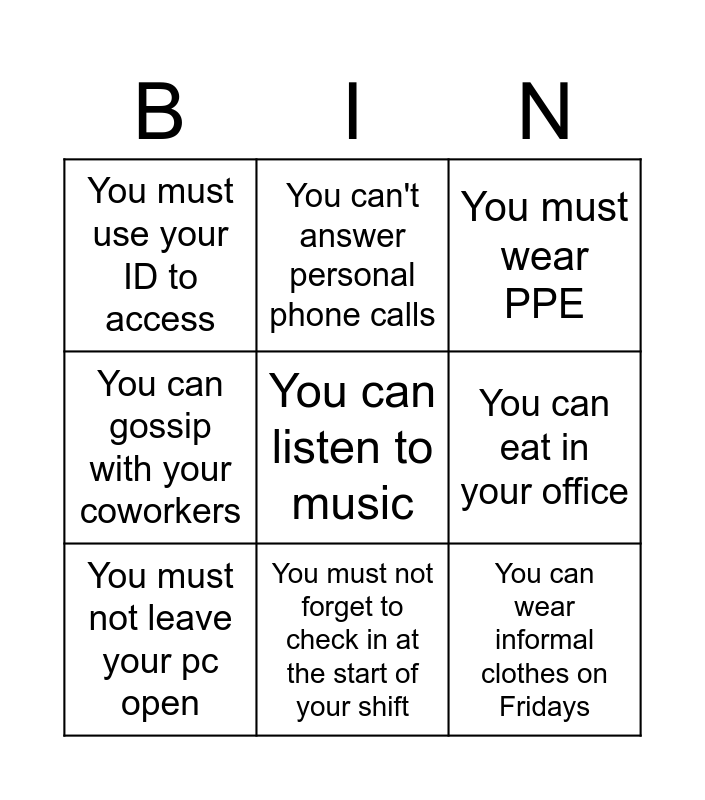 This bingo card has a free space and 8 words: You can eat in your office, You must wear PPE, You can't answer personal phone calls, You must not leave your pc open, You must use your ID to access, You can wear informal clothes on Fridays, You can gossip with your coworkers and You must not forget to check in at the start of your shift.