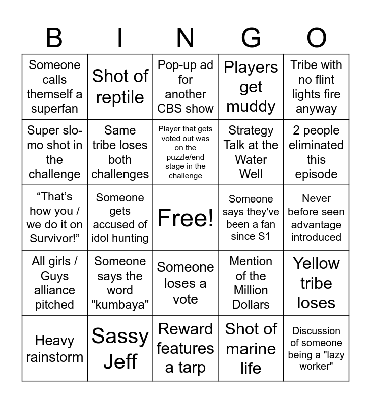 This bingo card has a free space and 37 words: Unanimous vote, Nobody finds a beware advantage, Someone mentions their "Survivor bucket list", Same tribe loses both challenges, Yellow tribe loses, Someone says the word "kumbaya", Player that gets voted out was on the puzzle/end stage in the challenge, Someone mentions which school they went to, Tribe with no flint lights fire anyway, At least 3 people cry, Someone gets accused of idol hunting, Players get muddy, Discussion of someone being a "lazy worker", Never before seen advantage introduced, Super slo-mo shot in the challenge, All girls / Guys alliance pitched, Someone tells us they're in the middle, Pop-up ad for another CBS show, Someone loses a vote, Someone says they've been a fan since S1, Someone calls themself a superfan, 2 people eliminated this episode, Heavy rainstorm, Reward features a tarp, Shot of bird, Shot of marine life, Shot of reptile, Shot of bug or spider, Someone complains about heat, "Dig deep!", "Let's get it on", Sassy Jeff, “That’s how you / we do it on Survivor!”, Someone says the word “vibe” or “vibes”, Mention of the Million Dollars, Strategy Talk at the Water Well and “At the end of the day…”.