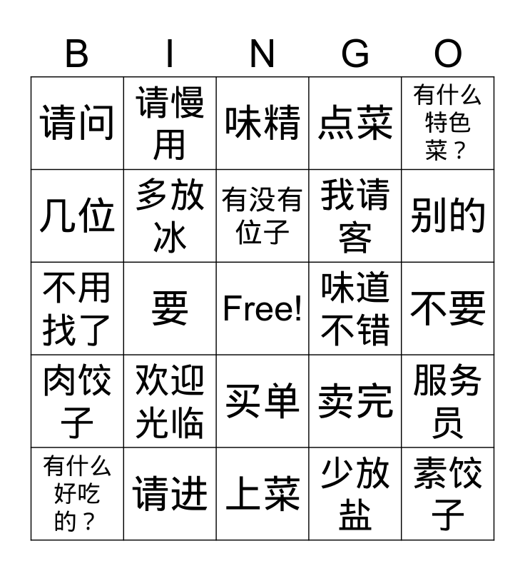 This bingo card has a free space and 24 words: 欢迎光临, 请进, 有没有位子, 有什么好吃的?, 有什么特色菜?, 请问, 几位, 请慢用, 味道不错, 买单, 我请客, 不用找了, 卖完, 服务员, 多放冰, 少放盐, 不要, 味精, 别的, 要, 素饺子, 肉饺子, 点菜 and 上菜.