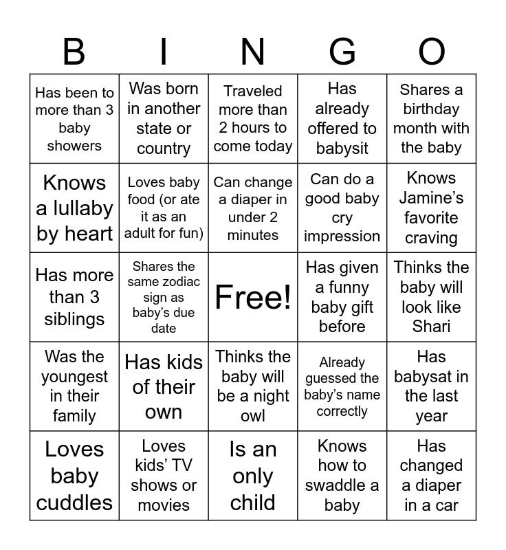 This bingo card has a free space and 25 words: Has kids of their own, Is an only child, Can change a diaper in under 2 minutes, Loves baby cuddles, Shares a birthday month with the baby, Has been to more than 3 baby showers, Knows a lullaby by heart, Was born in another state or country, Has given a funny baby gift before, Thinks the baby will be a night owl, Can do a good baby cry impression, Has more than 3 siblings, Already guessed the baby’s name correctly, Has babysat in the last year, Loves baby food (or ate it as an adult for fun), Thinks the baby will look like Jamine, Thinks the baby will look like Shari, Traveled more than 2 hours to come today, Knows Jamine’s favorite craving, Shares the same zodiac sign as baby’s due date, Has changed a diaper in a car, Loves kids’ TV shows or movies, Was the youngest in their family, Has already offered to babysit and Knows how to swaddle a baby.