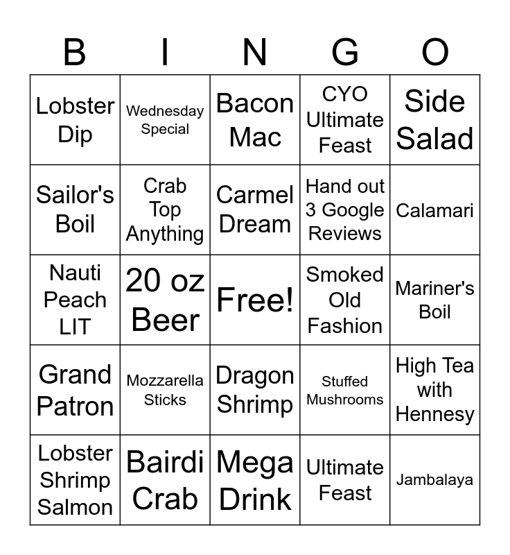 This bingo card has a free space and 24 words: Lobster Shrimp Salmon, Mozzarella Sticks, Carmel Dream, Ultimate Feast, Side Salad, Lobster Dip, Wednesday Special, Bacon Mac, Smoked Old Fashion, Mariner's Boil, Nauti Peach LIT, Crab Top Anything, Stuffed Mushrooms, High Tea with Hennesy, Sailor's Boil, Bairdi Crab, Mega Drink, CYO Ultimate Feast, Calamari, Grand Patron, 20 oz Beer, Dragon Shrimp, Hand out 3 Google Reviews and Jambalaya.