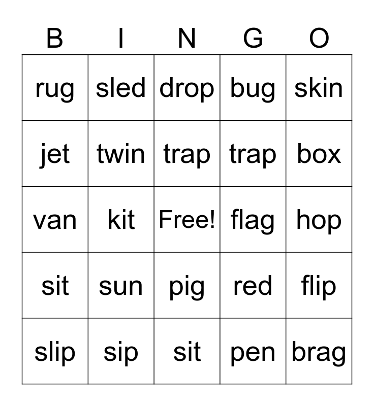 This bingo card has a free space and 34 words: map, pen, dog, bed, sit, twin, skin, slip, sled, frog, trap, drop, clip, plan, flag, box, sip, van, sun, red, pig, cup, rug, hop, sit, brag, bug, slam, trap, jet, pet, kit, flip and clap.