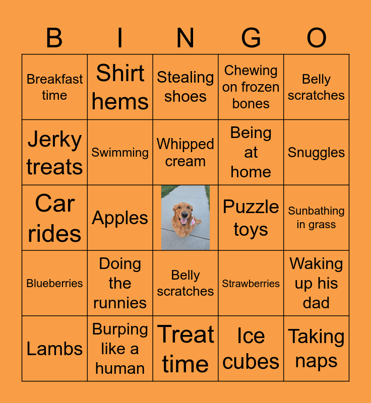 This bingo card has a free space and 24 words: Lambs, Doing the runnies, Whipped cream, Ice cubes, Belly scratches, Breakfast time, Shirt hems, Stealing shoes, Puzzle toys, Sunbathing in grass, Car rides, Swimming, Strawberries, Waking up his dad, Jerky treats, Burping like a human, Treat time, Chewing on frozen bones, Snuggles, Blueberries, Apples, Belly scratches, Being at home and Taking naps.