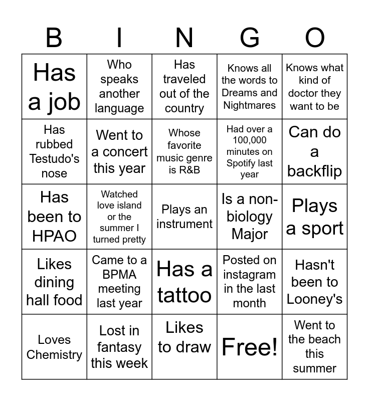 This bingo card has 30 words: Lost in fantasy this week, Studied in ESJ today, Watched love island or the summer I turned pretty, Lives in a dorm, Has a job, Has traveled out of the country, Went to a concert this year, Has a tattoo, Is a non-biology Major, Likes to draw, Plays a sport, Plays an instrument, Free!, Went to the beach this summer, Can do a backflip, Is scared of the mcat, Posted on instagram in the last month, Likes dining hall food, Came to a BPMA meeting last year, Knows what kind of doctor they want to be, Has been to HPAO, Has fallen off or been hit by a scooter, Who speaks another language, Had over a 100,000 minutes on Spotify last year, Has rubbed Testudo's nose, Knows all the words to Dreams and Nightmares, Hasn't been to Looney's, Loves Chemistry, Whose favorite music genre is R&B and Has seen Hamilton.