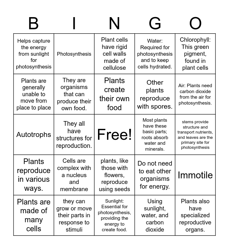 This bingo card has a free space and 24 words: Plants are made of many cells, Cells are complex with a nucleus and membrane, Plants create their own food, Using sunlight, water, and carbon dioxide, Chlorophyll: This green pigment, found in plant cells, Helps capture the energy from sunlight for photosynthesis, Photosynthesis, Plant cells have rigid cell walls made of cellulose, Most plants have these basic parts; roots absorb water and minerals., stems provide structure and transport nutrients, and leaves are the primary site for photosynthesis, Autotrophs, They are organisms that can produce their own food., Do not need to eat other organisms for energy., Immotile, Plants are generally unable to move from place to place, they can grow or move their parts in response to stimuli, Sunlight: Essential for photosynthesis, providing the energy to create food., Water: Required for photosynthesis and to keep cells hydrated., Air: Plants need carbon dioxide from the air for photosynthesis., Plants reproduce in various ways., They all have structures for reproduction., plants, like those with flowers, reproduce using seeds, Other plants reproduce with spores. and Plants also have specialized reproductive organs..