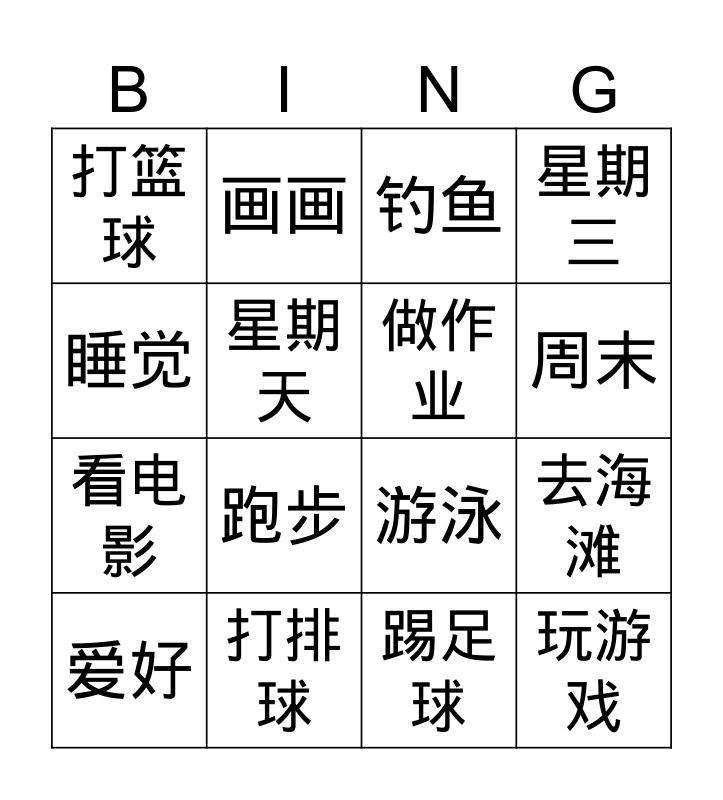 This bingo card has 16 words: 爱好, 打排球, 钓鱼, 星期三, 睡觉, 画画, 游泳, 去海滩, 打篮球, 星期天, 踢足球, 周末, 看电影, 跑步, 做作业 and 玩游戏.