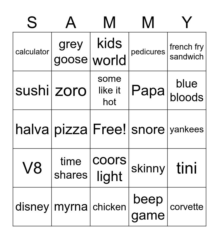 This bingo card has a free space and 29 words: disney, guns n moses, pizza, counting cash king, calculator, kids world, zoro, time shares, snore, myrna, yankees, corvette, chicken, beep game, blue bloods, kindle, coors light, V8, french fry sandwich, halva, skinny, insomniac, Papa, sushi, pedicures, grey goose, tini, some like it hot and the natural.