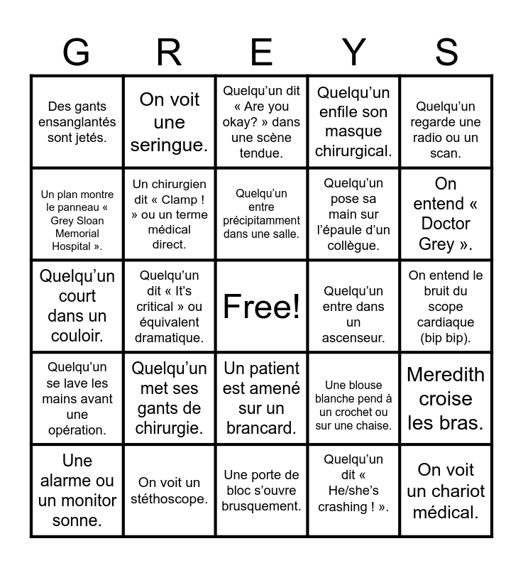This bingo card has a free space and 24 words: Quelqu’un met ses gants de chirurgie., On voit un stéthoscope., Quelqu’un entre précipitamment dans une salle., Une alarme ou un monitor sonne., Quelqu’un regarde une radio ou un scan., Des gants ensanglantés sont jetés., Un plan montre le panneau « Grey Sloan Memorial Hospital »., On voit une seringue., Quelqu’un entre dans un ascenseur., Un patient est amené sur un brancard., Quelqu’un pose sa main sur l’épaule d’un collègue., Quelqu’un court dans un couloir., Une blouse blanche pend à un crochet ou sur une chaise., Meredith croise les bras., Un chirurgien dit « Clamp ! » ou un terme médical direct., Quelqu’un dit « He/she’s crashing ! »., On entend le bruit du scope cardiaque (bip bip)., Quelqu’un dit « Are you okay? » dans une scène tendue., On entend « Doctor Grey »., Quelqu’un dit « It’s critical » ou équivalent dramatique., On voit un chariot médical., Quelqu’un se lave les mains avant une opération., Quelqu’un enfile son masque chirurgical. and Une porte de bloc s’ouvre brusquement..