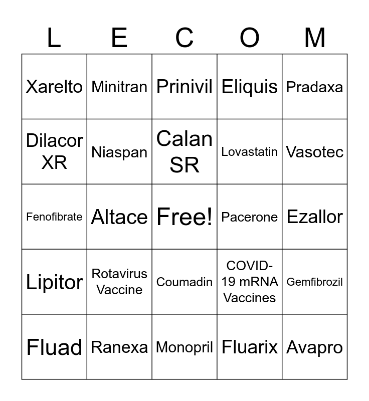 This bingo card has a free space and 24 words: Rotavirus Vaccine, Ranexa, Calan SR, Fluad, Pradaxa, Xarelto, Dilacor XR, Minitran, Pacerone, Coumadin, Lovastatin, Fenofibrate, COVID-19 mRNA Vaccines, Gemfibrozil, Niaspan, Fluarix, Ezallor, Prinivil, Vasotec, Altace, Avapro, Lipitor, Eliquis and Monopril.