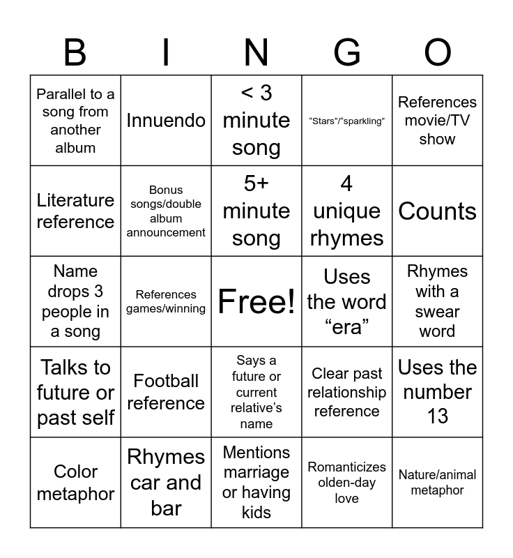 This bingo card has a free space and 24 words: Football reference, Rhymes car and bar, 5+ minute song, Color metaphor, References movie/TV show, Parallel to a song from another album, Literature reference, Innuendo, Uses the word “era”, Says a future or current relative’s name, 4 unique rhymes, Name drops 3 people in a song, Clear past relationship reference, Uses the number 13, Bonus songs/double album announcement, Romanticizes olden-day love, Rhymes with a swear word, < 3 minute song, Counts, References games/winning, Nature/animal metaphor, Talks to future or past self, “Stars”/“sparkling” and Mentions marriage or having kids.