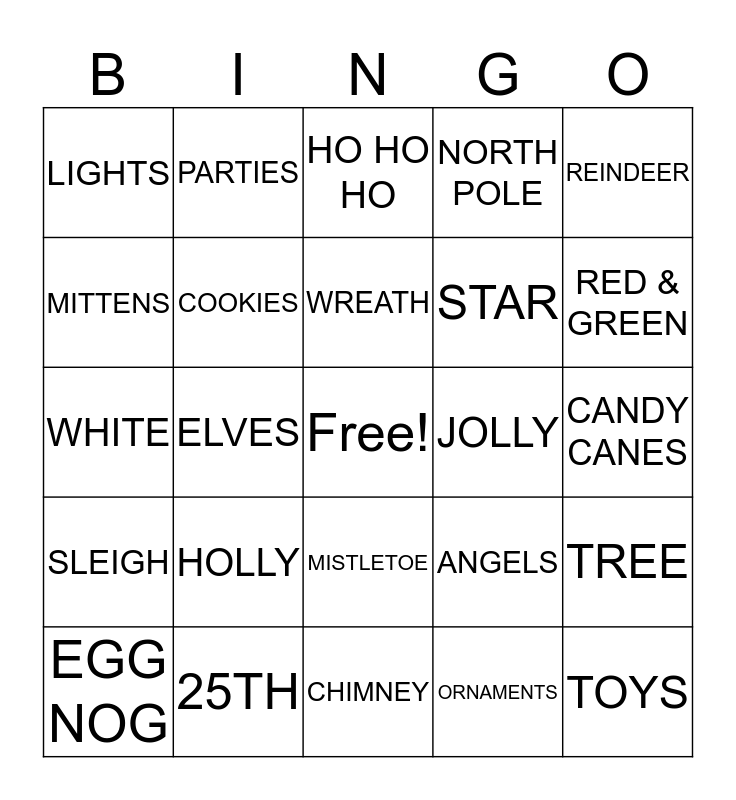 This bingo card has a free space and 39 words: ANGELS, SNOWFLAKES, SNOWMAN, COOKIES, EGG NOG, MISTLETOE, WREATH, STOCKINGS, REINDEER, SLEIGH, ELVES, NORTH POLE, TOYS, CANDY CANES, JOLLY, HOLLY, MAGIC, LIGHTS, SANTA, ANGELS, MITTENS, CHIMNEY, STAR, RED & GREEN, SILVER BELLS, LIST, NAUGHTY, NICE, CAROLS, PARTIES, MERRY, JINGLE, HO HO HO, 25TH, ORNAMENTS, GINGERBREAD MAN, TREE, WHITE and PRESENTS.