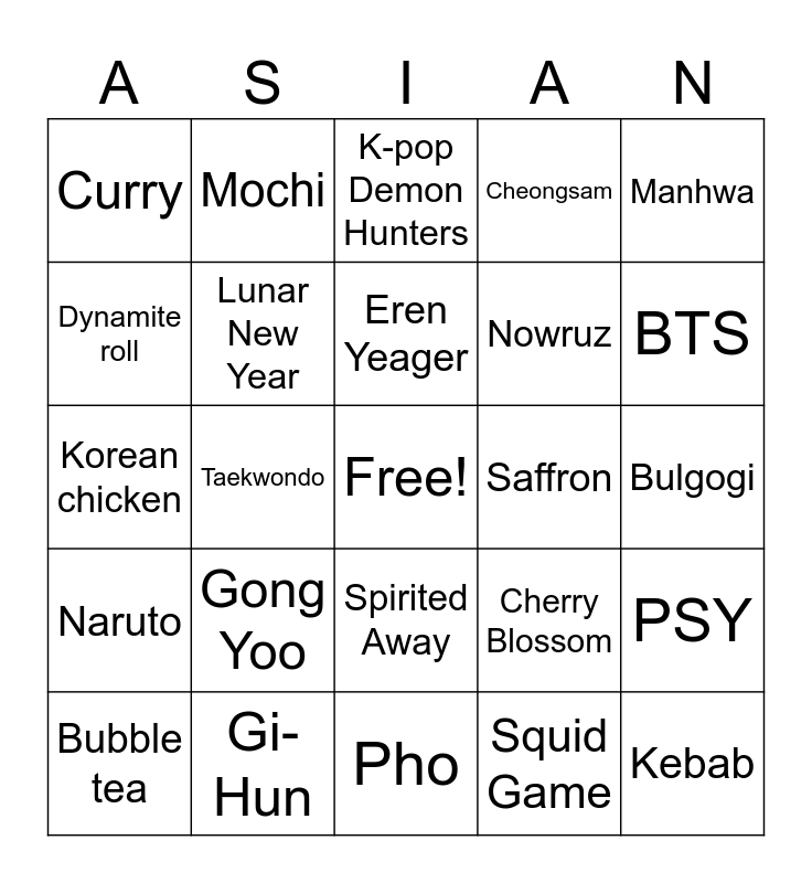 This bingo card has a free space and 56 words: Sushi, Bubble tea, Ramen, Curry, Pho, Spring rolls, Lunar New Year, Eid, Nowruz, Kimono, Cheongsam, Hanbok, K-pop, Anime, K-drama, Manga, Manhwa, Taekwondo, Chopsticks, Kebab, Saffron, Dragon, Cherry Blossom, K-pop Demon Hunters, Naan, Eren Yeager, Rice, New Jeans, BTS, Kimchi, Blackpink, Attack on Titan, Pokémon, TWICE, Bulgogi, Dynamite roll, Korean chicken, Noodles, Naruto, Mochi, Spirited Away, Seaweed, Karate, Rush Hour, Rush Hour 2, Gong Yoo, Gi-Hun, Frontman, BTS Dynamite, Satoru Gojo, Squid Game, Pita bread, Juje Kebab, Haikyuu, PSY and Jung Kook.