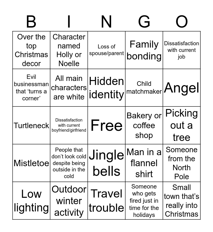This bingo card has 1 images, a free space and 81 words: Single mom with child, Loss of spouse/parent, Single man - dreamy, gentle, sensitive, Author or healthcare worker, Fancy house despite $ troubles, Sweaters, Scarves, Broaches, Love triangle, Letter to Santa, Santa is real, All main characters are white, Bakery or coffee shop, Failing business with time limit, Over the top Christmas decor, Low lighting, Evil businessman that ‘turns a corner’, Sharing of lifelong dreams, Town gathering, Caroling, Child matchmaker, Small town that’s really into Christmas, Dissatisfaction with current job, Dissatisfaction with current boyfriend/girlfriend, Heartwarming background music, Helpful mysterious stranger, Christmas magic, Mysterious stranger music, Red article of clothing, People that don’t look cold despite being outside in the cold, Large mug of coffee/tea/cider, Turtleneck, Hair with soft curls, Fake snow, Travel trouble, Santa’s kid, Santa-like character, Angel, Kissing in the snow, Rediscovering Christmas joy, Family bonding, Workaholic, Going home for Christmas, Community Christmas tree lighting, Character named Holly or Noelle, Character named Nick or Chris, Hidden identity, A huge misunderstanding, Falling in love in approximately 3 days, Decorating montage (trees, homes, cookies, etc), Picking out a tree, Outdoor winter activity, Busy executive, Santa non-believer, Someone who is stranded, A nemesis, Sleigh ride, Meddling mother, Man in a flannel shirt, Blizzard that changes everyone’s plans, Earmuffs, Mistletoe, Plotline that is stolen from a popular movie, Meaningful Christmas gift, Christmas pageant, Existential crisis, Folgers product placement, An old flame who comes back into the picture, Real reindeer, Overly enthusiastic neighbors, A charming country barn, Jingle bells, Someone who gets fired just in time for the holidays, A bad pun, A contest, Someone who hates Christmas, A miscommunication, Tinsel, A secret passion for something artistic, Someone from the North Pole and Glass of wine.