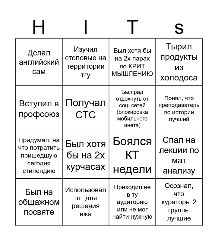 This bingo card has 16 words: Использовал гпт для решения ежа, Спал на лекции по мат анализу, Был хотя бы на 2х парах по КРИТ МЫШЛЕНИЮ, Делал английский сам, Придумал, на что потратить пришедшую сегодня стипендию, Изучил столовые на территории тгу, Боялся КТ недели, Приходил не в ту аудиторию или не мог найти нужную, Вступил в профсоюз, Получал СТС, Был на общажном посвяте, Тырил продукты из холодоса, Был хотя бы на 2х курчасах, Понял, что преподаватель по истории лучший, Был рад отдохнуть от соц. сетей (блокировка мобильного инета) and Осознал, что кураторы 2 группы лучшие.