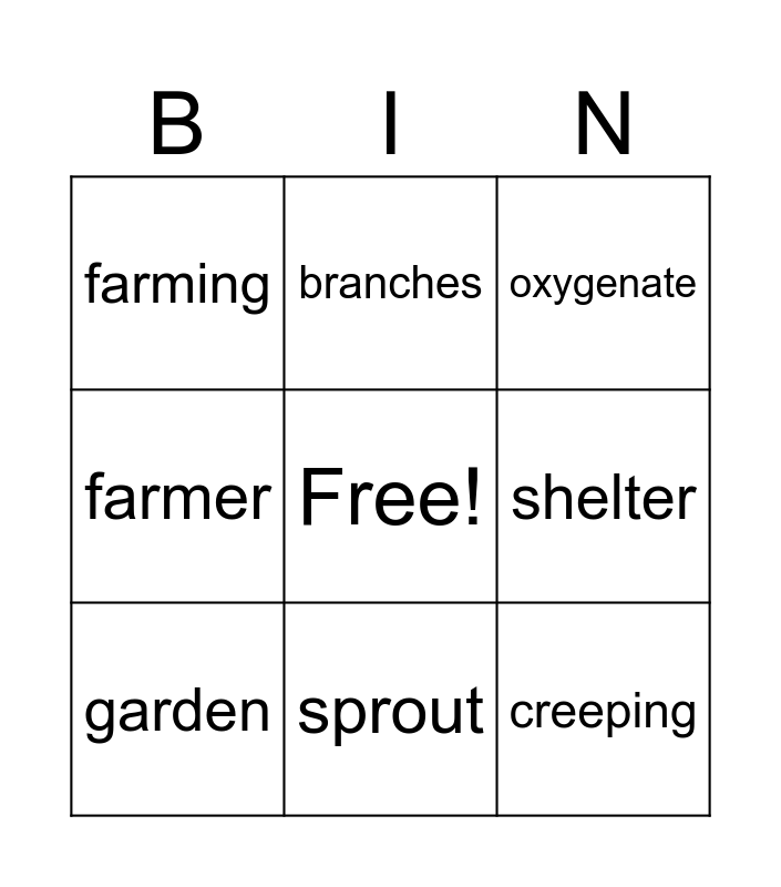 This bingo card has a free space and 35 words: climber, creeper, flower, garden, nature, farmer, shelter, oxygen, sprout, medicine, sunlight, creeping, planting, growing, farming, shading, watering, seeding, rooting, blooming, budding, flowers, gardens, fruits, oxygenate, medicines, greenery, planting, shaded, sheltering, climbers, creepers, leaves, branches and forests.
