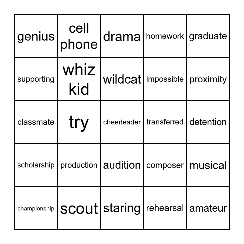 This bingo card has 25 words: production, staring, wildcat, championship, graduate, genius, supporting, cell phone, transferred, audition, impossible, classmate, composer, musical, whiz kid, amateur, detention, drama, proximity, try, cheerleader, scout, scholarship, homework and rehearsal.