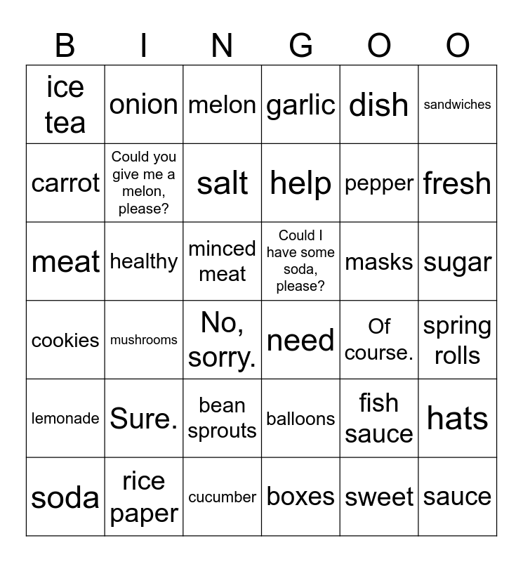 This bingo card has 36 words: balloons, bean sprouts, boxes, carrot, cookies, Could I have some soda, please?, Could you give me a melon, please?, cucumber, dish, fish sauce, fresh, garlic, hats, healthy, help, ice tea, lemonade, masks, meat, melon, minced meat, mushrooms, need, No, sorry., Of course., onion, pepper, rice paper, salt, sandwiches, sauce, soda, spring rolls, sugar, Sure. and sweet.