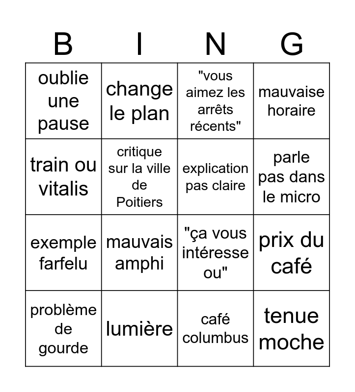 This bingo card has 16 words: lumière, prix du café, "vous aimez les arrêts récents", oublie une pause, exemple farfelu, change le plan, "ça vous intéresse ou", café columbus, train ou vitalis, critique sur la ville de Poitiers, problème de gourde, mauvaise horaire, mauvais amphi, parle pas dans le micro, explication pas claire and tenue moche.