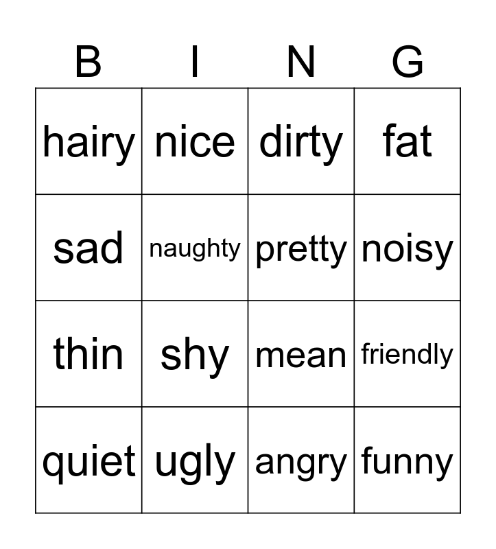 This bingo card has 16 words: ugly, friendly, dirty, hairy, thin, nice, mean, angry, sad, naughty, quiet, fat, shy, noisy, pretty and funny.