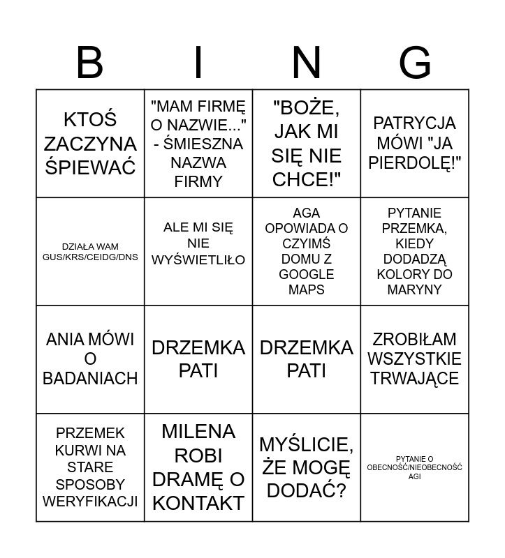 This bingo card has 16 words: MILENA ROBI DRAMĘ O KONTAKT, ZROBIŁAM WSZYSTKIE TRWAJĄCE, "BOŻE, JAK MI SIĘ NIE CHCE!", KTOŚ ZACZYNA ŚPIEWAĆ, ANIA MÓWI O BADANIACH, "MAM FIRMĘ O NAZWIE..." - ŚMIESZNA NAZWA FIRMY, DRZEMKA PATI, MYŚLICIE, ŻE MOGĘ DODAĆ?, DZIAŁA WAM GUS/KRS/CEIDG/DNS, ALE MI SIĘ NIE WYŚWIETLIŁO, PRZEMEK KURWI NA STARE SPOSOBY WERYFIKACJI, PATRYCJA MÓWI "JA PIERDOLĘ!", DRZEMKA PATI, PYTANIE PRZEMKA, KIEDY DODADZĄ KOLORY DO MARYNY, AGA OPOWIADA O CZYIMŚ DOMU Z GOOGLE MAPS and PYTANIE O OBECNOŚĆ/NIEOBECNOŚĆ AGI.