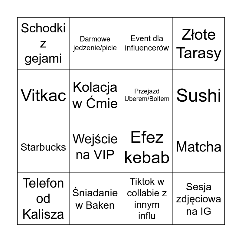 This bingo card has 16 words: Śniadanie w Baken, Matcha, Event dla influencerów, Schodki z gejami, Starbucks, Darmowe jedzenie/picie, Efez kebab, Tiktok w collabie z innym influ, Vitkac, Kolacja w Ćmie, Telefon od Kalisza, Złote Tarasy, Wejście na VIP, Sushi, Przejazd Uberem/Boltem and Sesja zdjęciowa na IG.