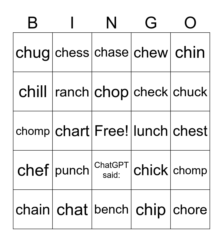This bingo card has a free space and 26 words: ChatGPT said:, chip, chop, chat, chin, chug, chill, chess, chest, chick, check, chomp, chomp, chain, chart, charm, chew, chef, chase, chore, chuck, bench, lunch, punch, ranch and peach.