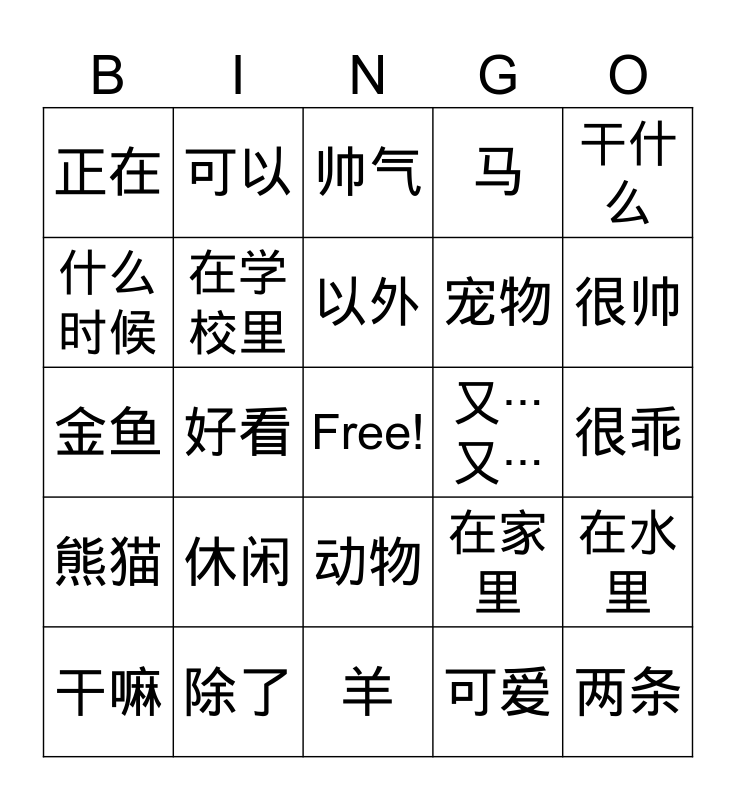 This bingo card has a free space and 24 words: 休闲, 除了, 以外, 干嘛, 干什么, 正在, 什么时候, 可以, 又···又···, 动物, 宠物, 金鱼, 在家里, 在水里, 在学校里, 可爱, 很乖, 帅气, 很帅, 好看, 两条, 熊猫, 马 and 羊.