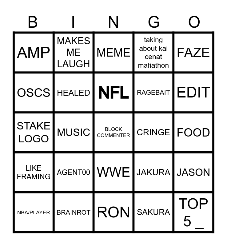 This bingo card has a free space and 24 words: AGENT00, BRAINROT, NFL, NBA/PLAYER, FAZE, AMP, OSCS, MAKES ME LAUGH, CRINGE, WWE, RAGEBAIT, STAKE LOGO, JAKURA, JASON, HEALED, SAKURA, FOOD, MEME, EDIT, MUSIC, TOP 5 _, LIKE FRAMING, taking about kai cenat mafiathon and RON.