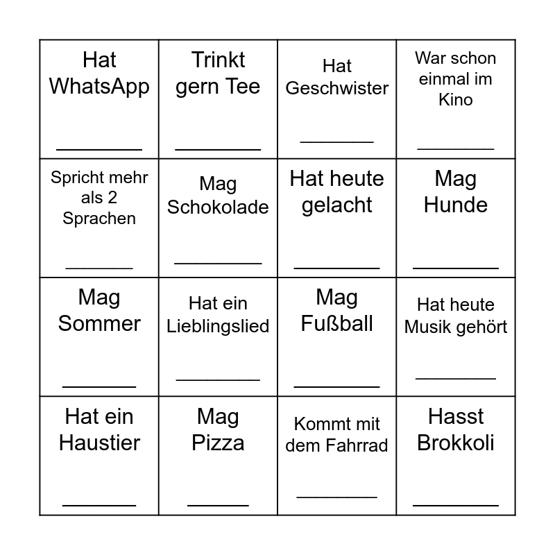 This bingo card has 16 words: Hat ein Haustier ______, Mag Pizza _____, Hat Geschwister _______, War schon einmal im Kino ________, Spricht mehr als 2 Sprachen _______, Trinkt gern Tee _______, Mag Fußball _______, Hat heute Musik gehört ________, Hat WhatsApp _______, Mag Schokolade ________, Kommt mit dem Fahrrad ________, Mag Hunde _______, Mag Sommer ______, Hat ein Lieblingslied ________, Hat heute gelacht _______ and Hasst Brokkoli _______.