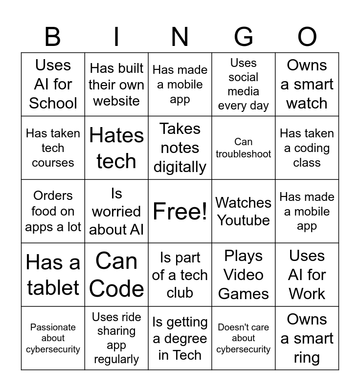 This bingo card has a free space and 24 words: Can Code, Uses ride sharing app regularly, Takes notes digitally, Passionate about cybersecurity, Owns a smart watch, Uses AI for School, Has taken tech courses, Has built their own website, Watches Youtube, Is part of a tech club, Can troubleshoot, Orders food on apps a lot, Plays Video Games, Uses AI for Work, Hates tech, Doesn't care about cybersecurity, Has made a mobile app, Has made a mobile app, Has taken a coding class, Is worried about AI, Owns a smart ring, Has a tablet, Uses social media every day and Is getting a degree in Tech.