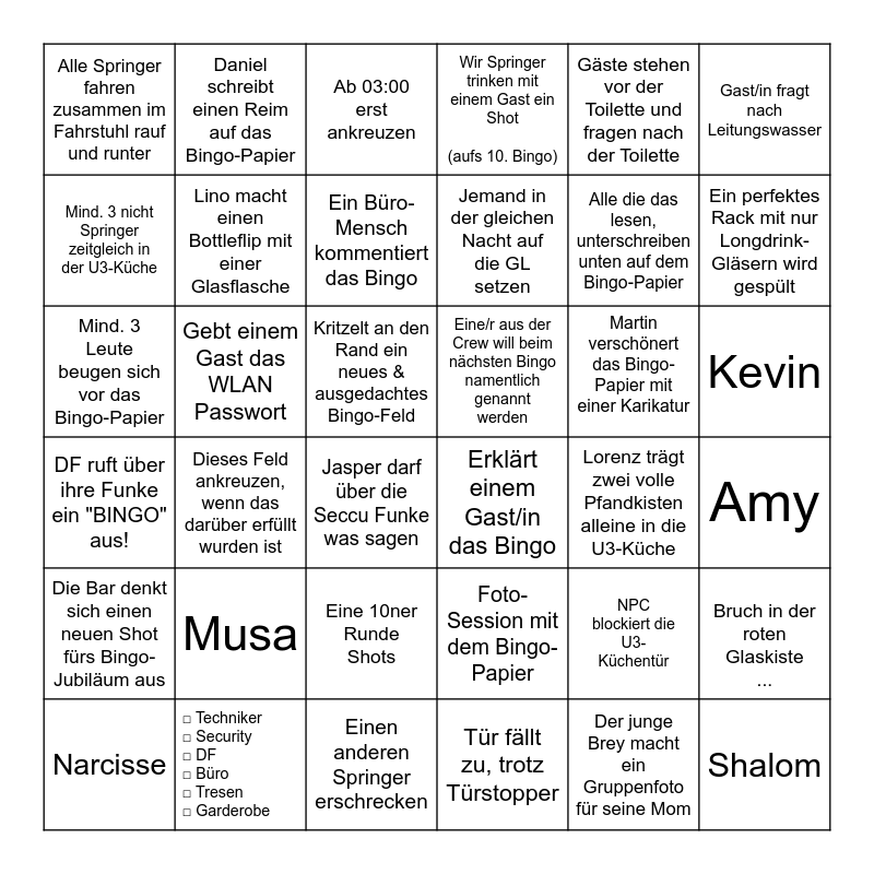 This bingo card has 36 words: Foto-Session mit dem Bingo-Papier, Eine 10ner Runde Shots, Tür fällt zu, trotz Türstopper, Mind. 3 nicht Springer zeitgleich in der U3-Küche, DF ruft über ihre Funke ein "BINGO" aus!, Eine/r aus der Crew will beim nächsten Bingo namentlich genannt werden, Lino macht einen Bottleflip mit einer Glasflasche, Einen anderen Springer erschrecken, Gäste stehen vor der Toilette und fragen nach der Toilette, NPC blockiert die U3-Küchentür, Ein perfektes Rack mit nur Longdrink-Gläsern wird gespült, Wir Springer trinken mit einem Gast ein Shot (aufs 10. Bingo), Bruch in der roten Glaskiste ..., Gebt einem Gast das WLAN Passwort, Jemand in der gleichen Nacht auf die GL setzen, Alle Springer fahren zusammen im Fahrstuhl rauf und runter, Die Bar denkt sich einen neuen Shot fürs Bingo-Jubiläum aus, Martin verschönert das Bingo-Papier mit einer Karikatur, Mind. 3 Leute beugen sich vor das Bingo-Papier, Ab 03:00 erst ankreuzen, Kritzelt an den Rand ein neues & ausgedachtes Bingo-Feld, Dieses Feld ankreuzen, wenn das darüber erfüllt wurden ist, Erklärt einem Gast/in das Bingo, Jasper darf über die Seccu Funke was sagen, Lorenz trägt zwei volle Pfandkisten alleine in die U3-Küche, Daniel schreibt einen Reim auf das Bingo-Papier, Alle die das lesen, unterschreiben unten auf dem Bingo-Papier, □ Techniker □ Security □ DF □ Büro □ Tresen □ Garderobe, Ein Büro-Mensch kommentiert das Bingo, Gast/in fragt nach Leitungswasser, Shalom, Narcisse, Amy, Kevin, Musa and Der junge Brey macht ein Gruppenfoto für seine Mom.