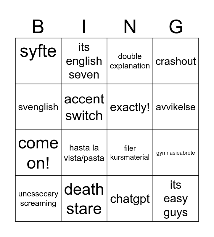 This bingo card has 16 words: death stare, gymnasieabrete, double explanation, syfte, come on!, its english seven, filer kursmaterial, chatgpt, svenglish, accent switch, unessecary screaming, crashout, hasta la vista/pasta, avvikelse, exactly! and its easy guys.