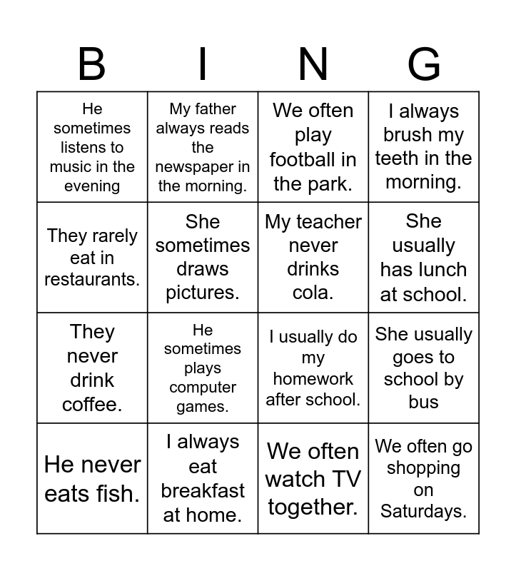 This bingo card has 16 words: I always eat breakfast at home., She usually goes to school by bus, We often play football in the park., He sometimes listens to music in the evening, They never drink coffee., My father always reads the newspaper in the morning., I usually do my homework after school., We often watch TV together., They rarely eat in restaurants., She sometimes draws pictures., He never eats fish., I always brush my teeth in the morning., He sometimes plays computer games., She usually has lunch at school., My teacher never drinks cola. and We often go shopping on Saturdays..