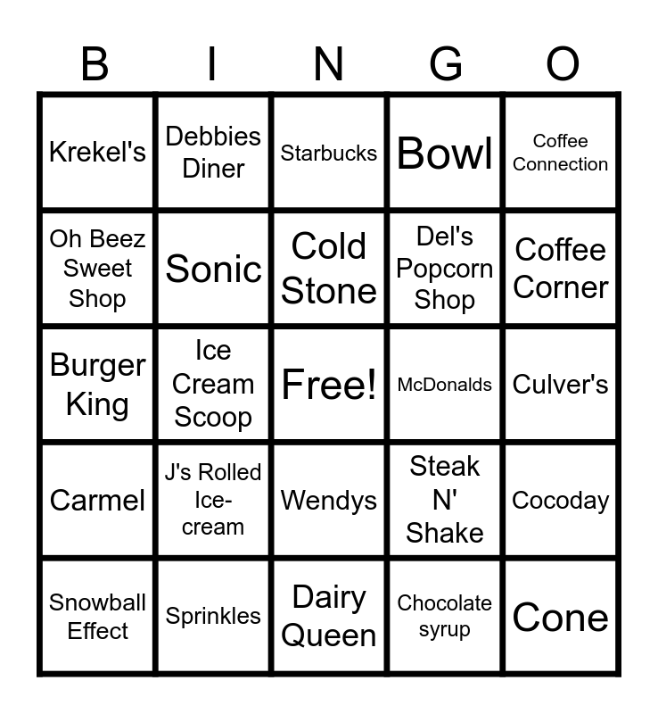 This bingo card has a free space and 25 words: J's Rolled Ice-cream, Dairy Queen, Cold Stone, Snowball Effect, Coffee Connection, Krekel's, Oh Beez Sweet Shop, Debbies Diner, McDonalds, Wendys, Del's Popcorn Shop, Burger King, Steak N' Shake, Cocoday, Sonic, Hardee's, Culver's, Starbucks, Coffee Corner, Ice Cream Scoop, Cone, Sprinkles, Carmel, Bowl and Chocolate syrup.